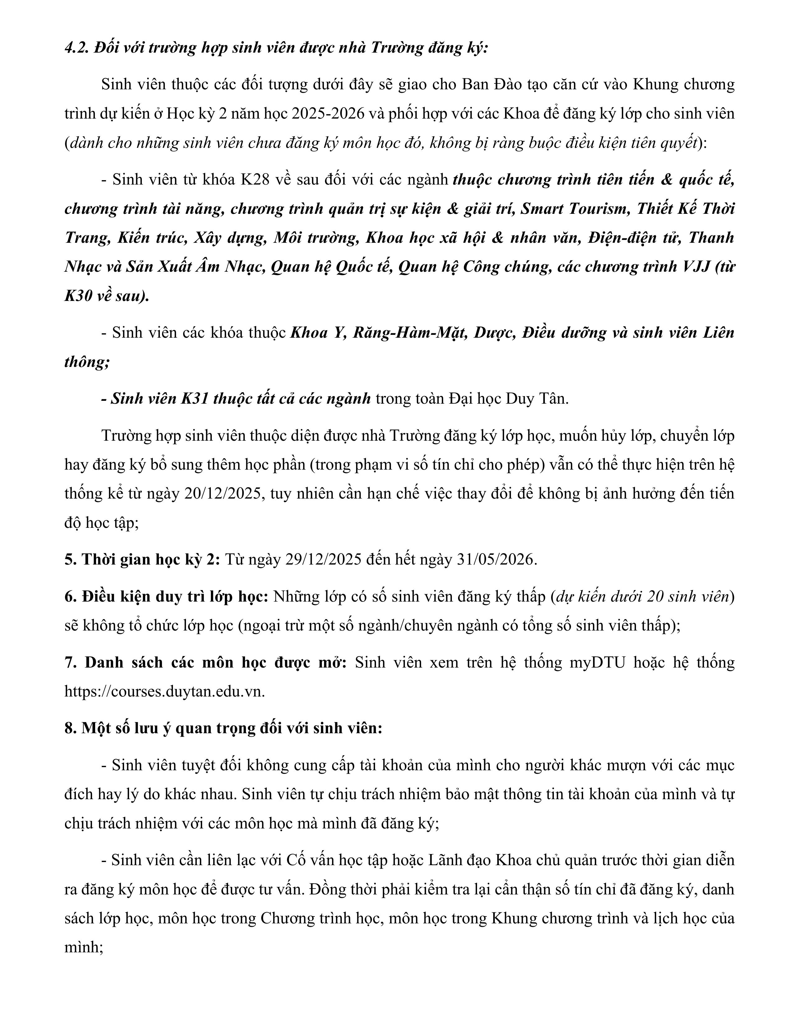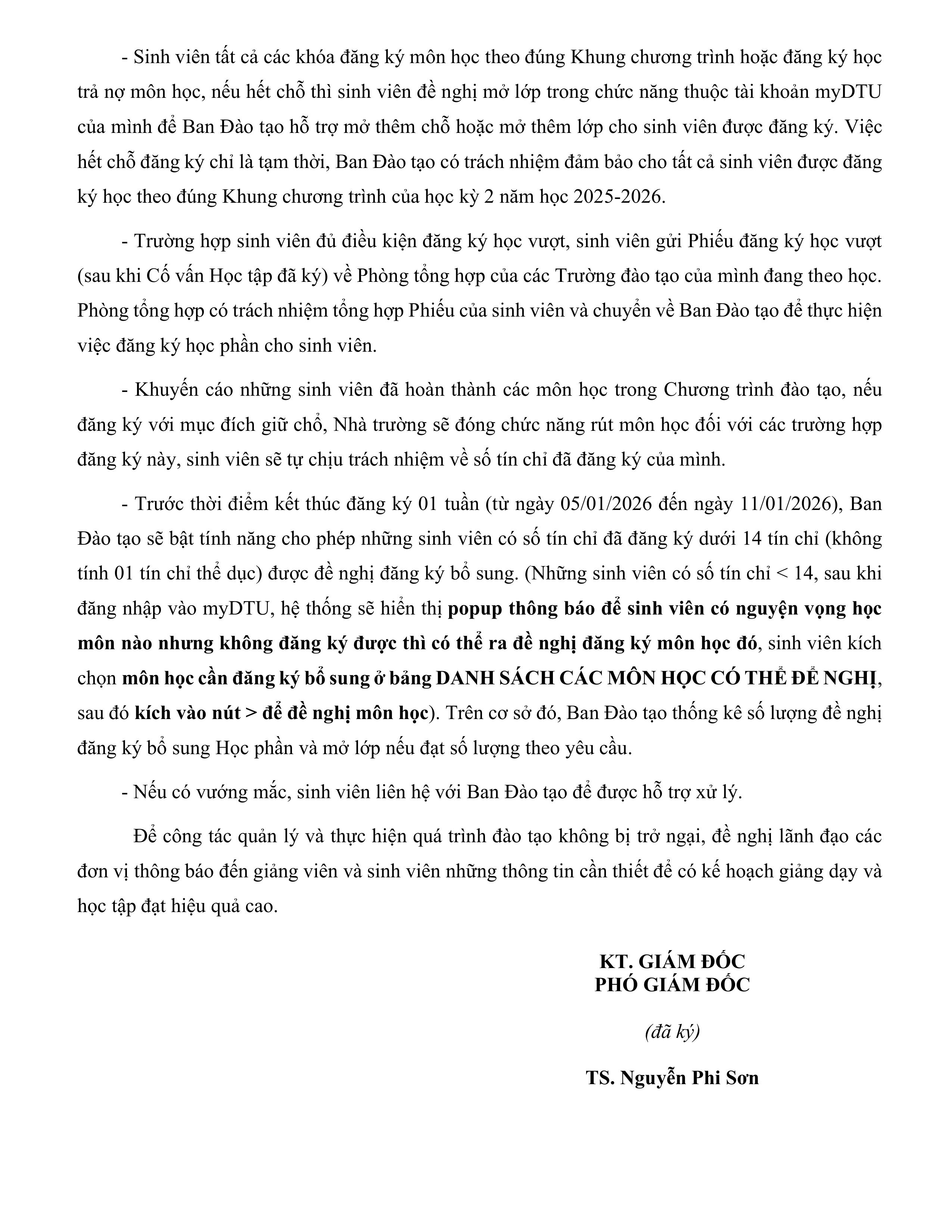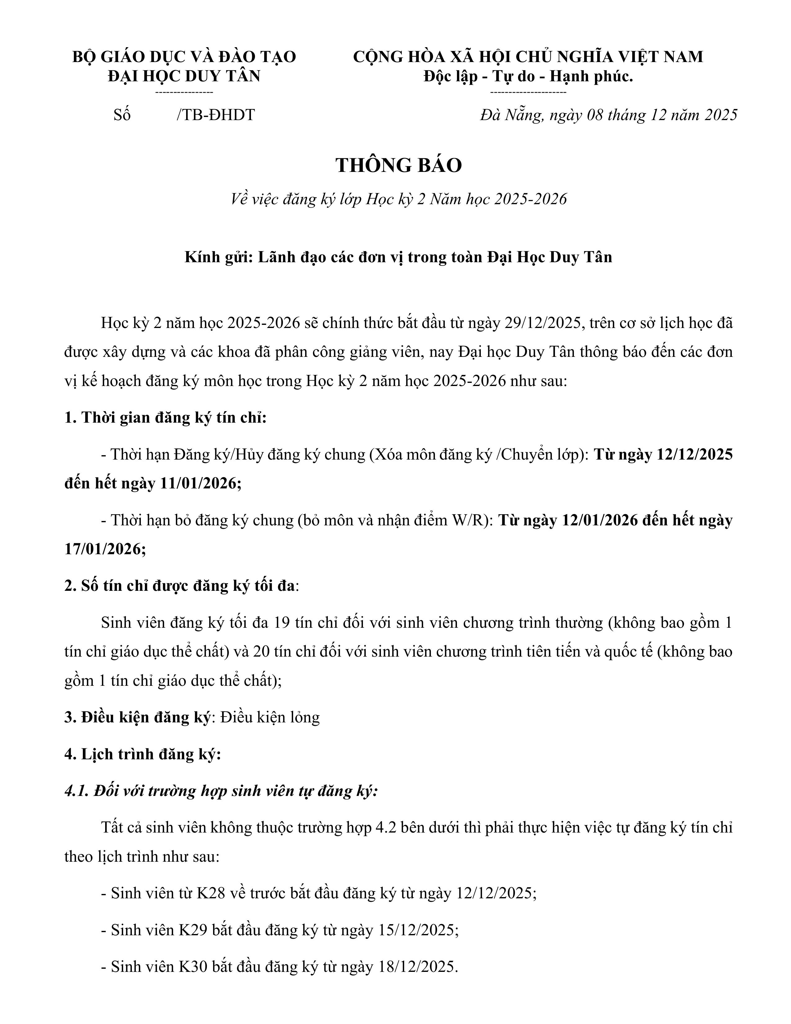 Thông báo Thời gian Đăng ký lớp Học kỳ 2 - Năm học 2025-2026