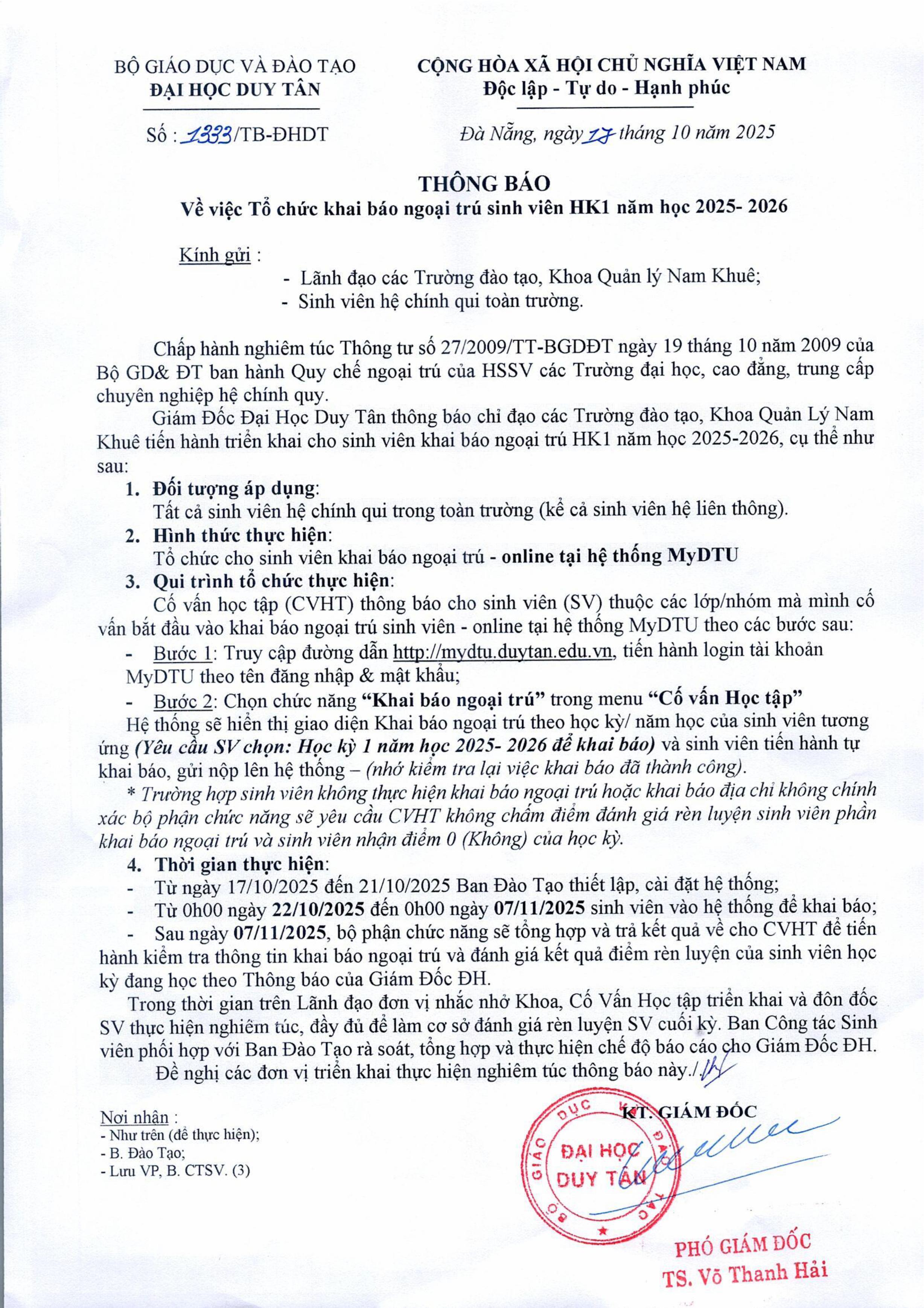 Thông báo V/v Tổ chức khai báo ngoại trú sinh viên HK1 năm học 2025-2026